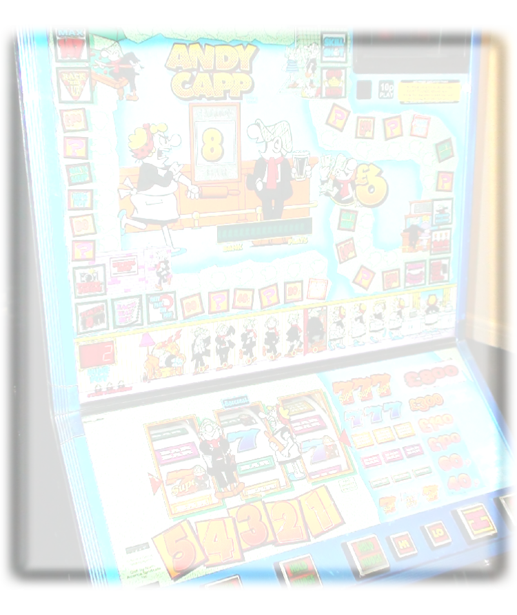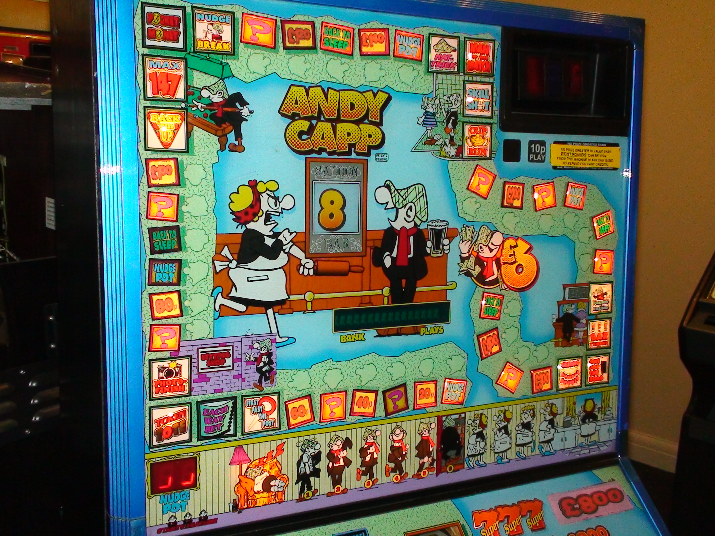 It’s a Barcrest Andy Capp which has sadly been converted from £6 to £8 all cash jackpot. The conversion is shoddy and the bottom glass has been butchered when the mask was pulled off and the decals altered. The new awards are poorly reproduced and there’s not much that can be done to repair the mess really.