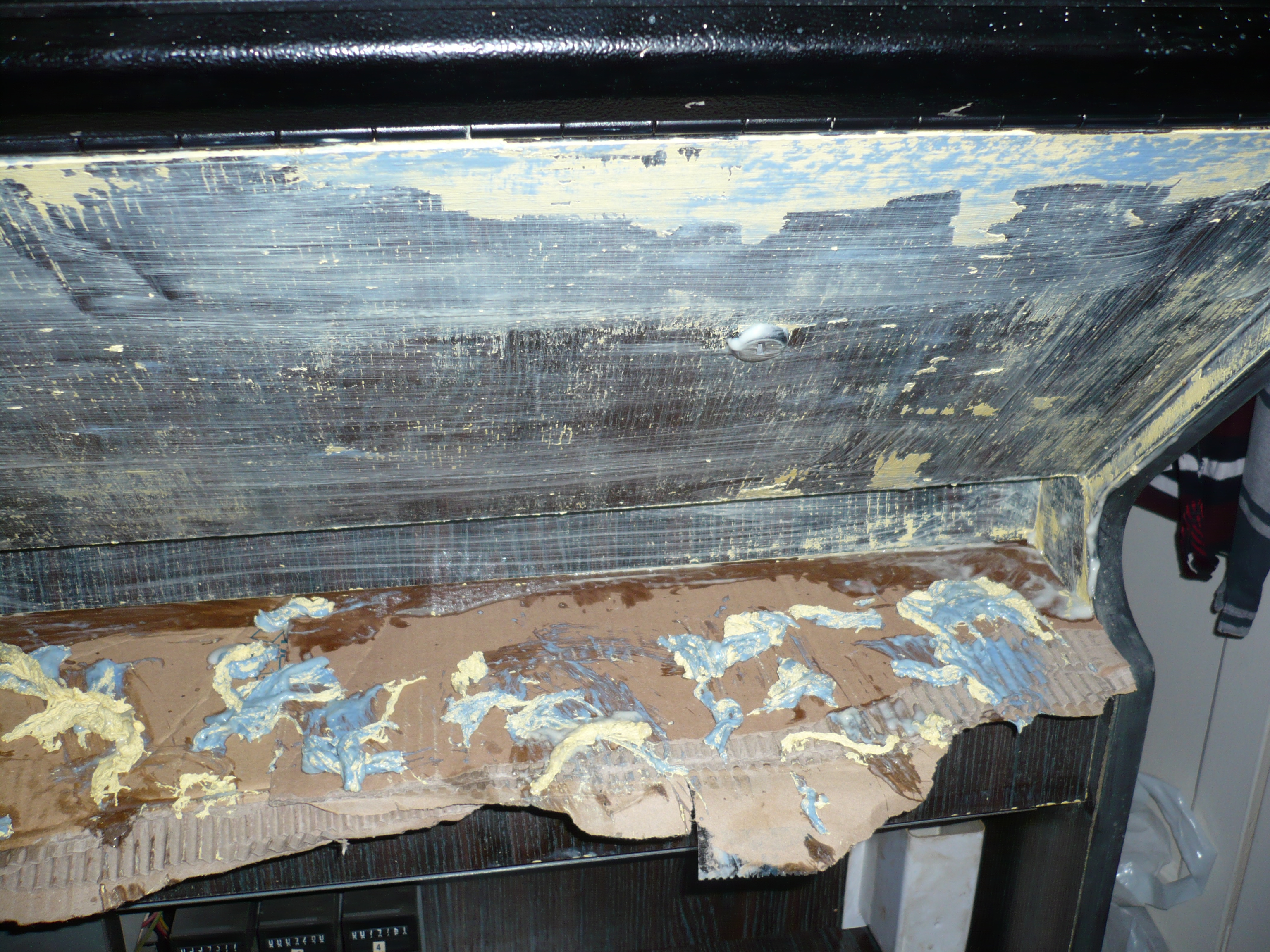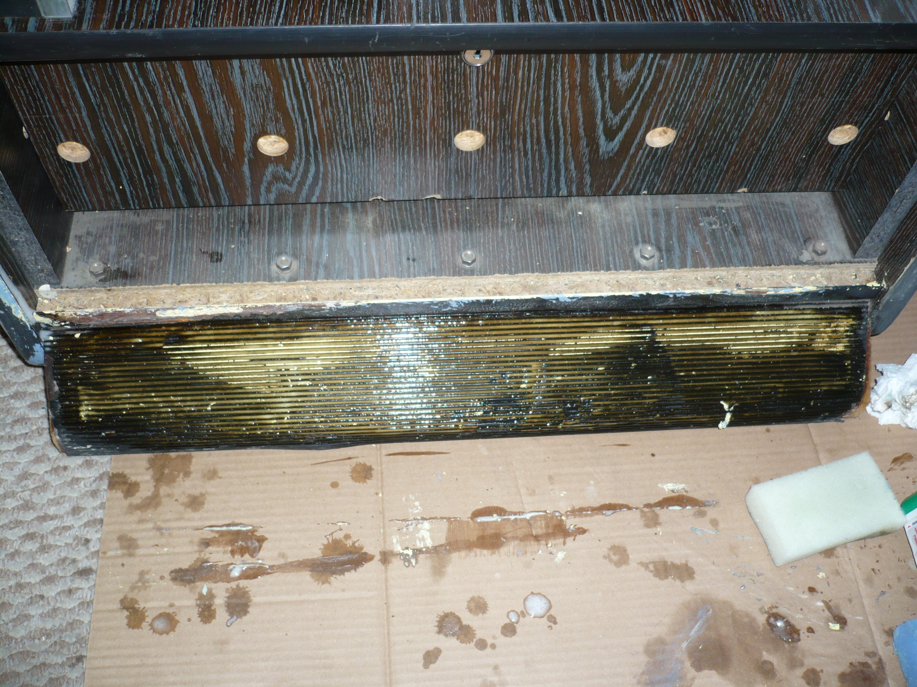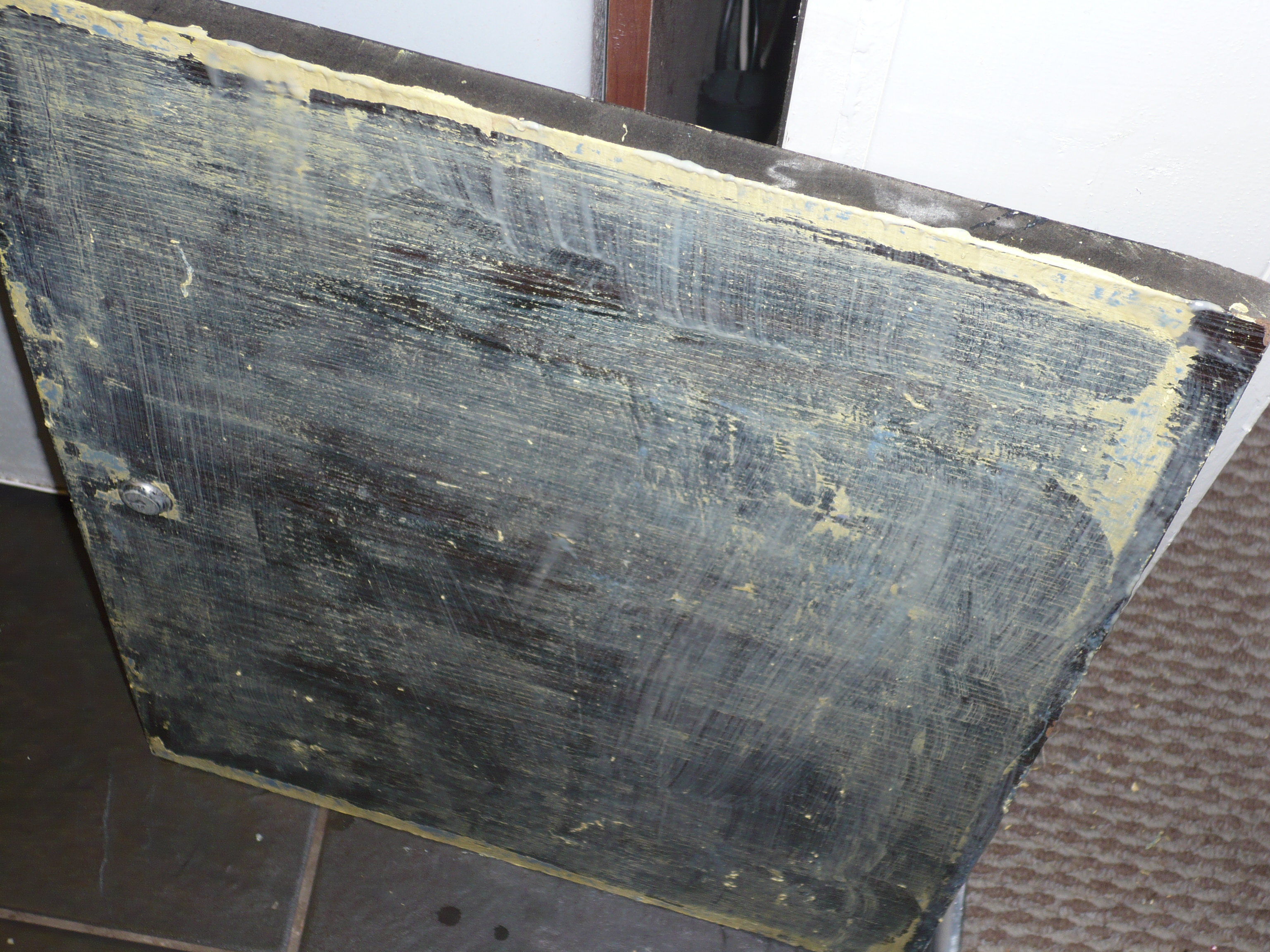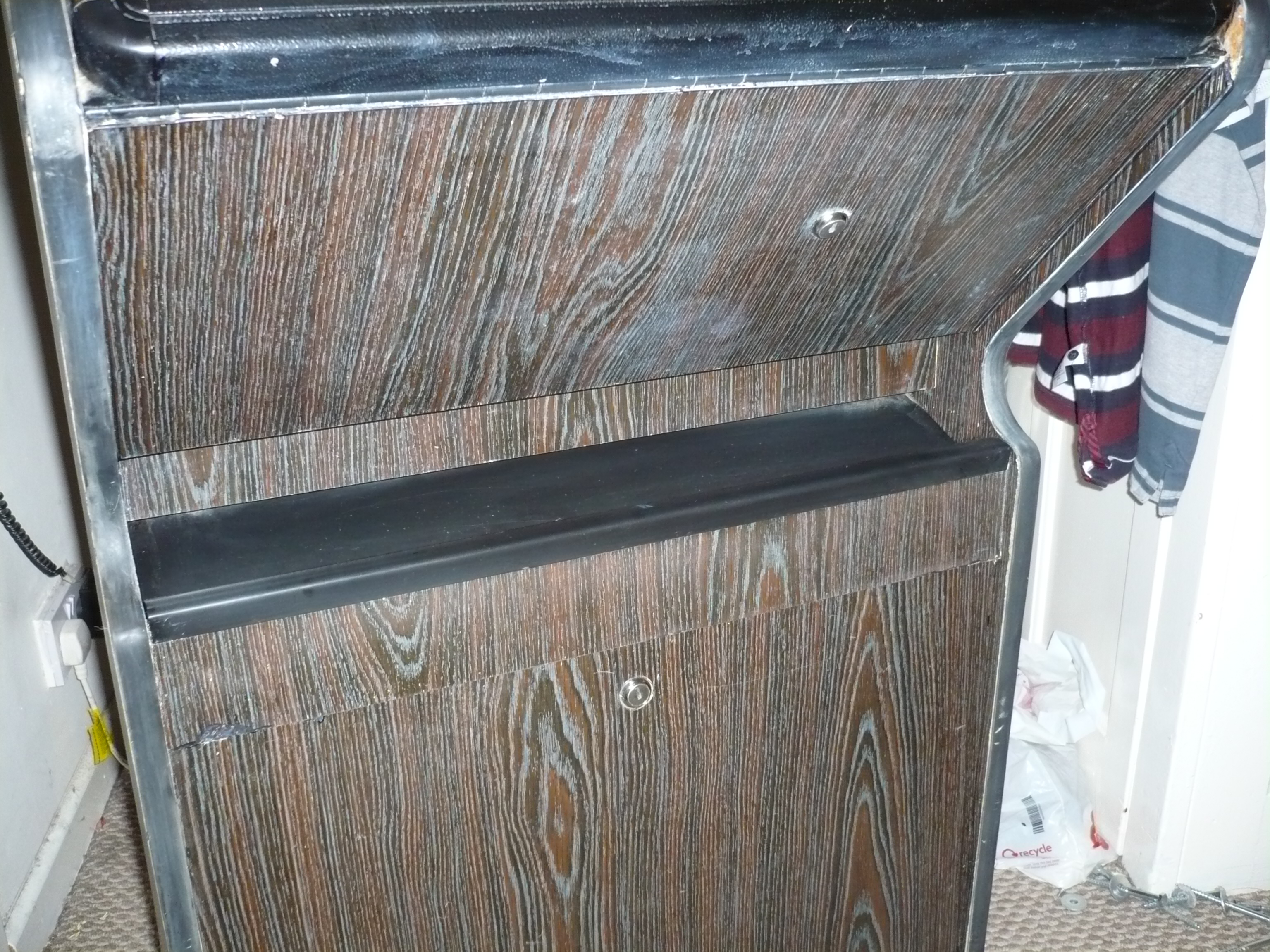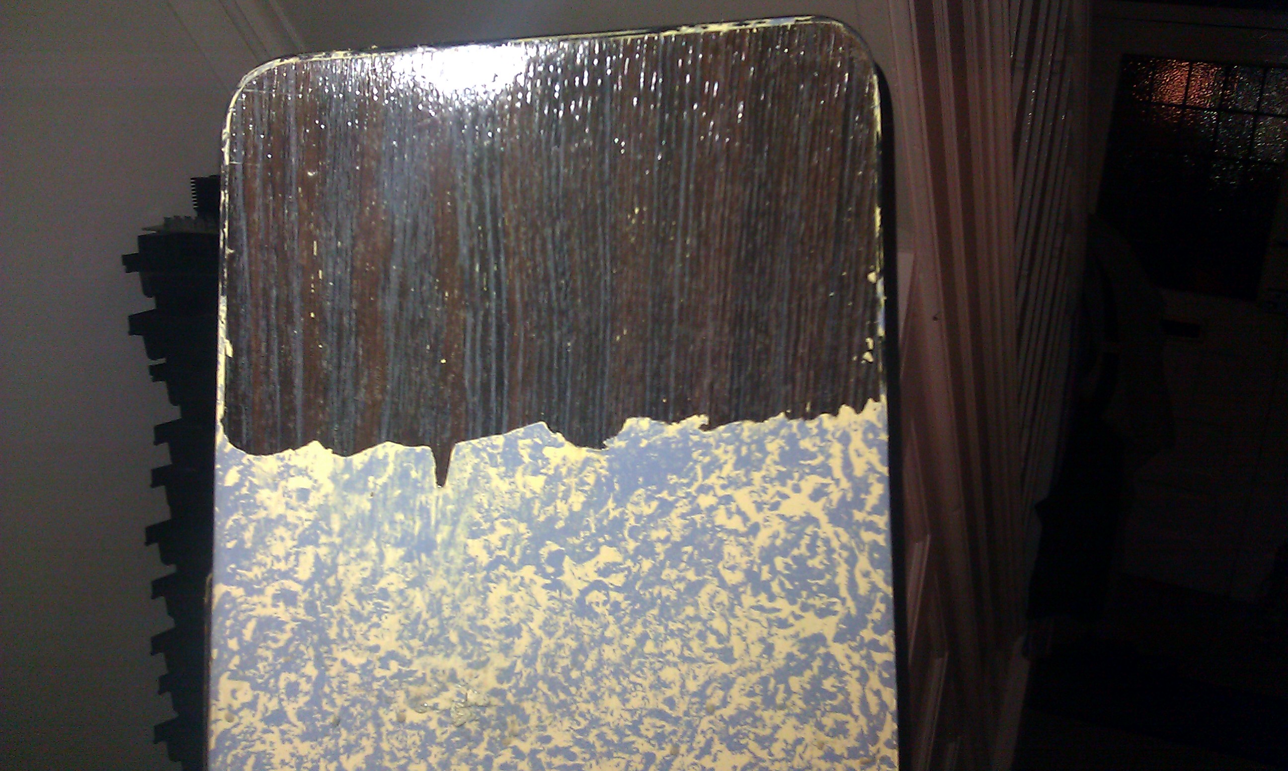 The entire Golden Award cabinet had been painted in magnolia emulsion and then purple emulsion had been sponged onto top. The T-mold had been painted purple. It took me 10 hours to strip it off using Nitromores, wire wool, lots of hot water and many scouring pads.