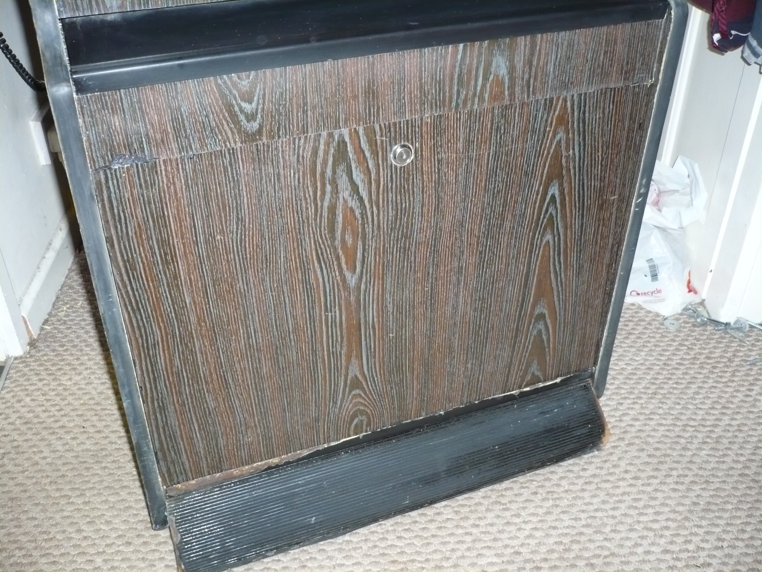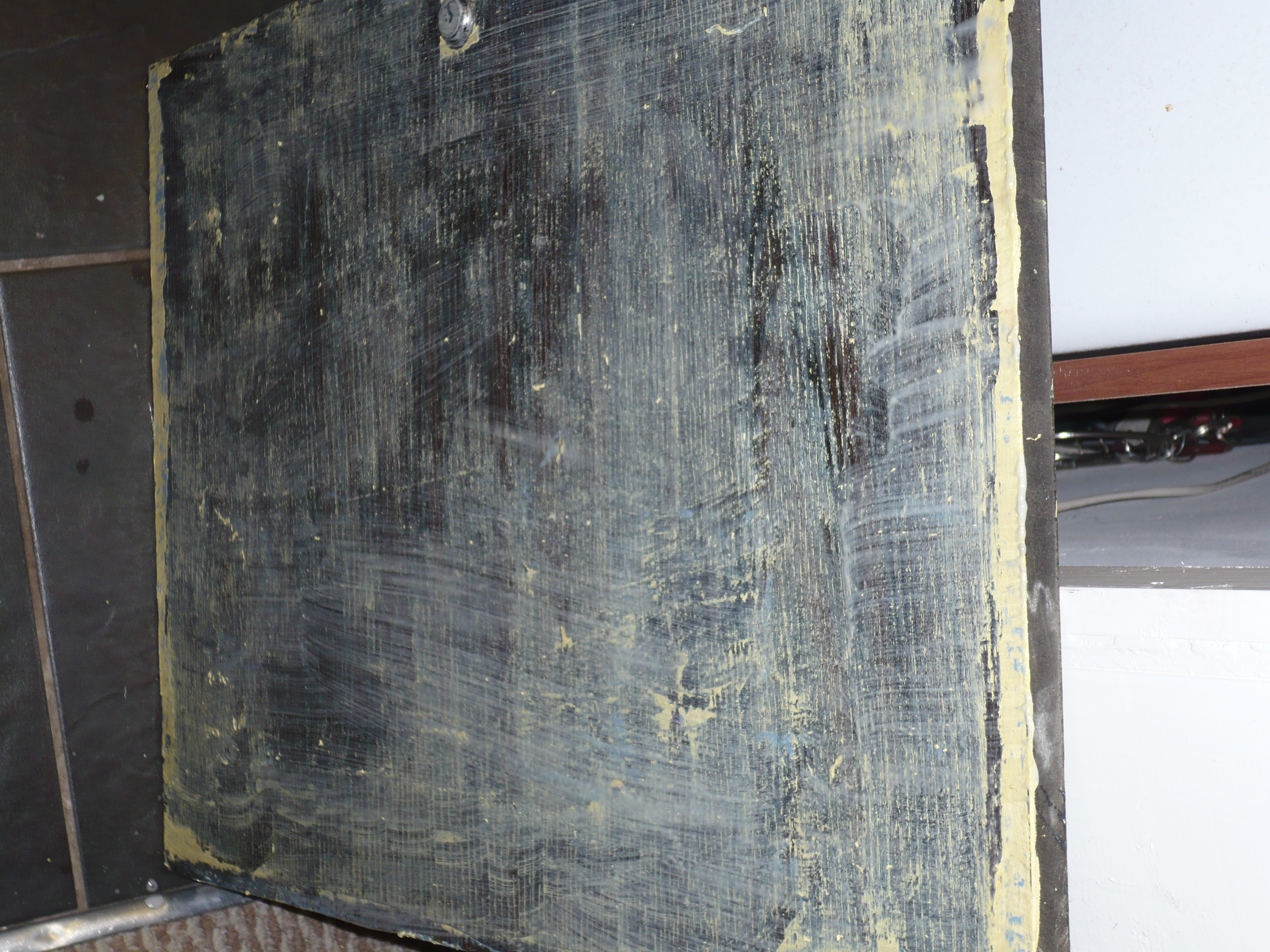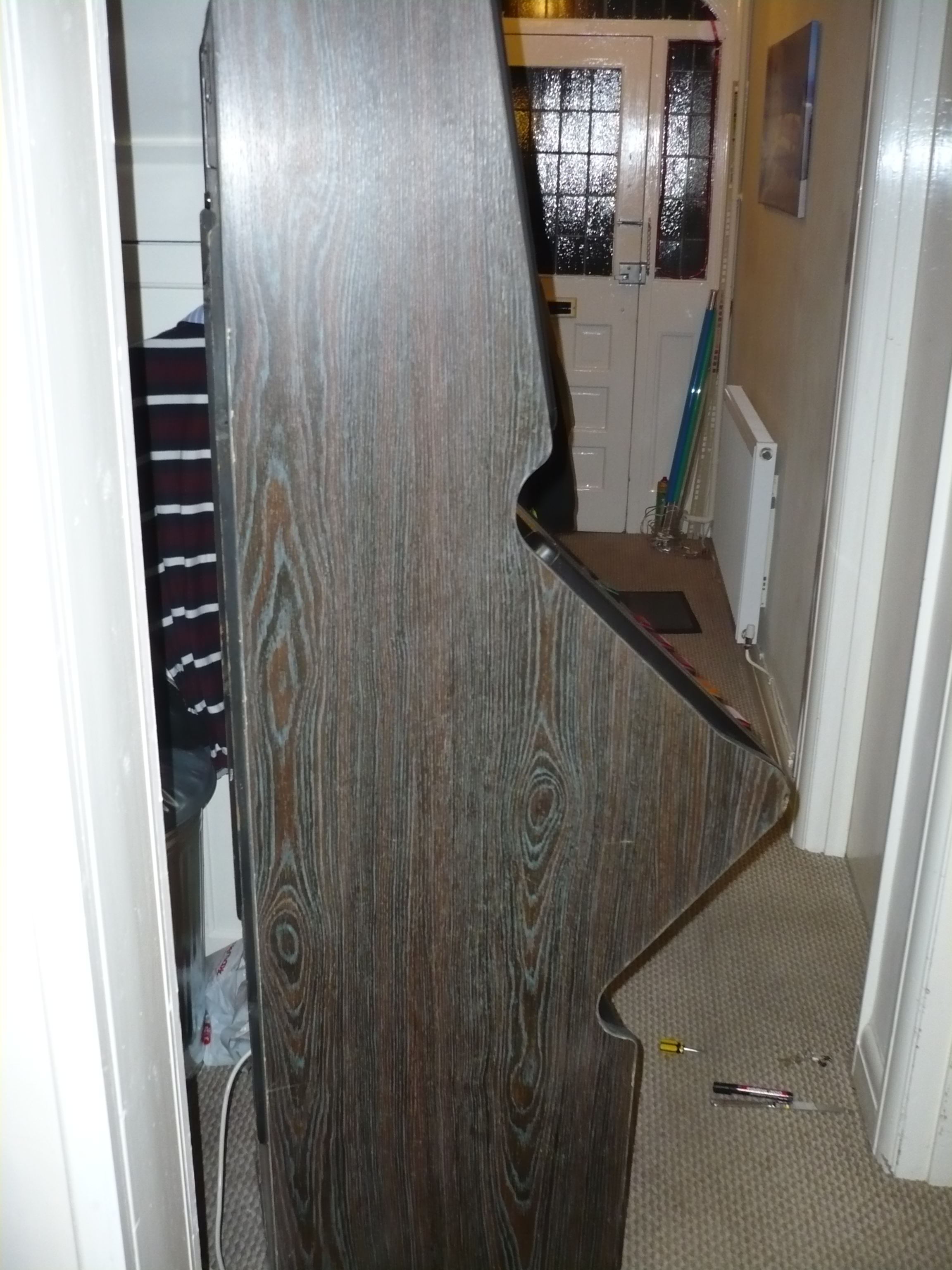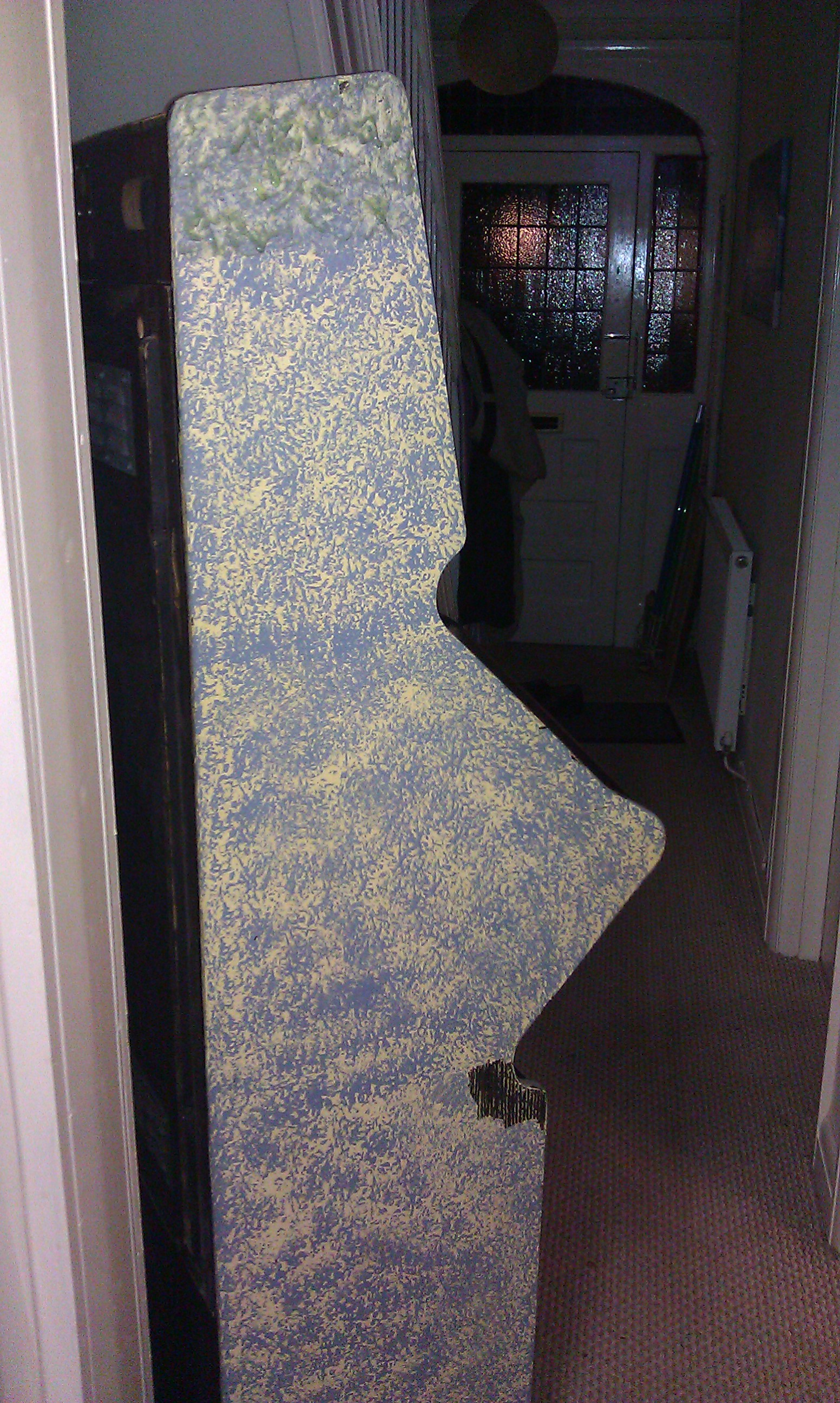 The entire Golden Award cabinet had been painted in magnolia emulsion and then purple emulsion had been sponged onto top. The T-mold had been painted purple. It took me 10 hours to strip it off using Nitromores, wire wool, lots of hot water and many scouring pads.