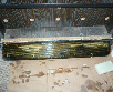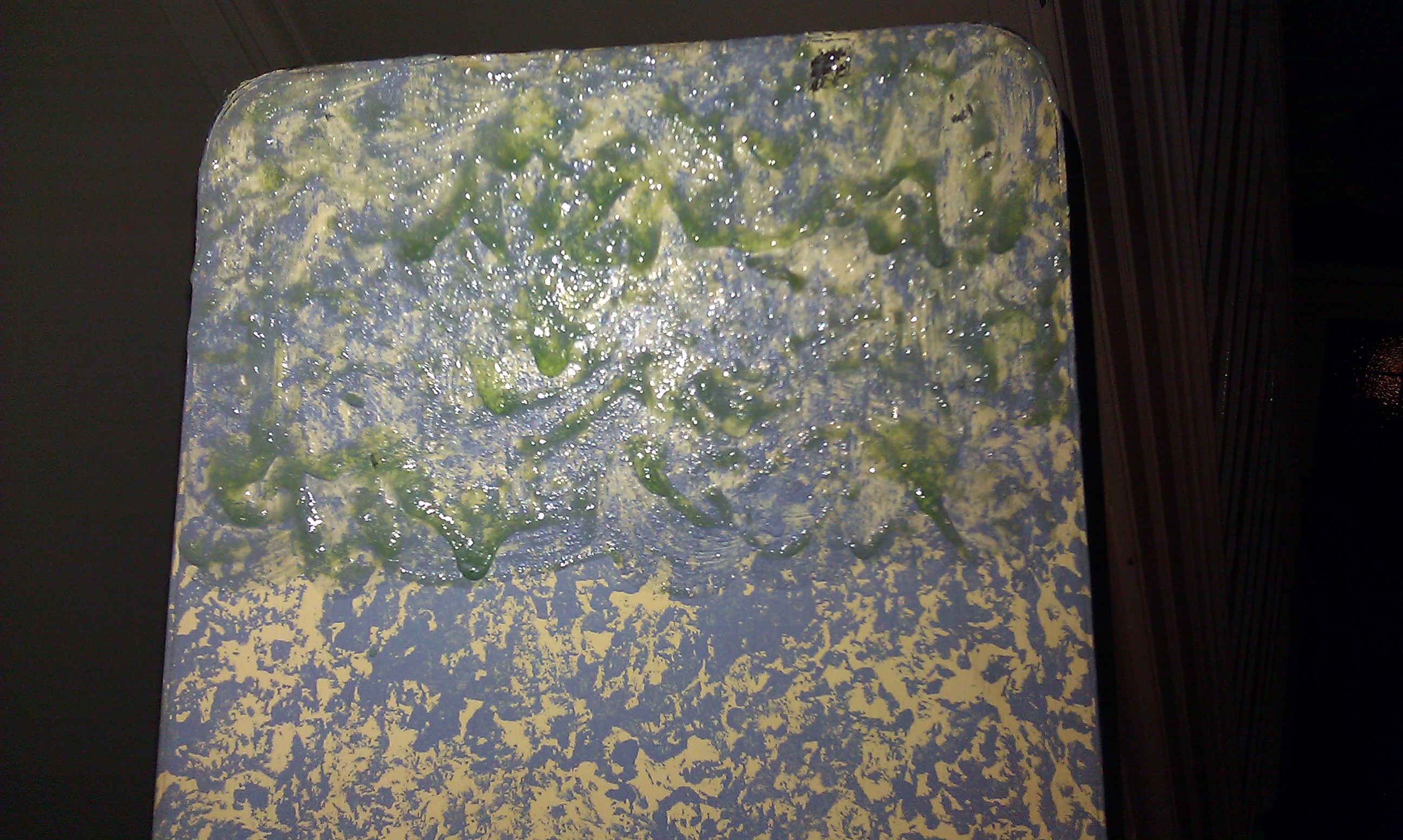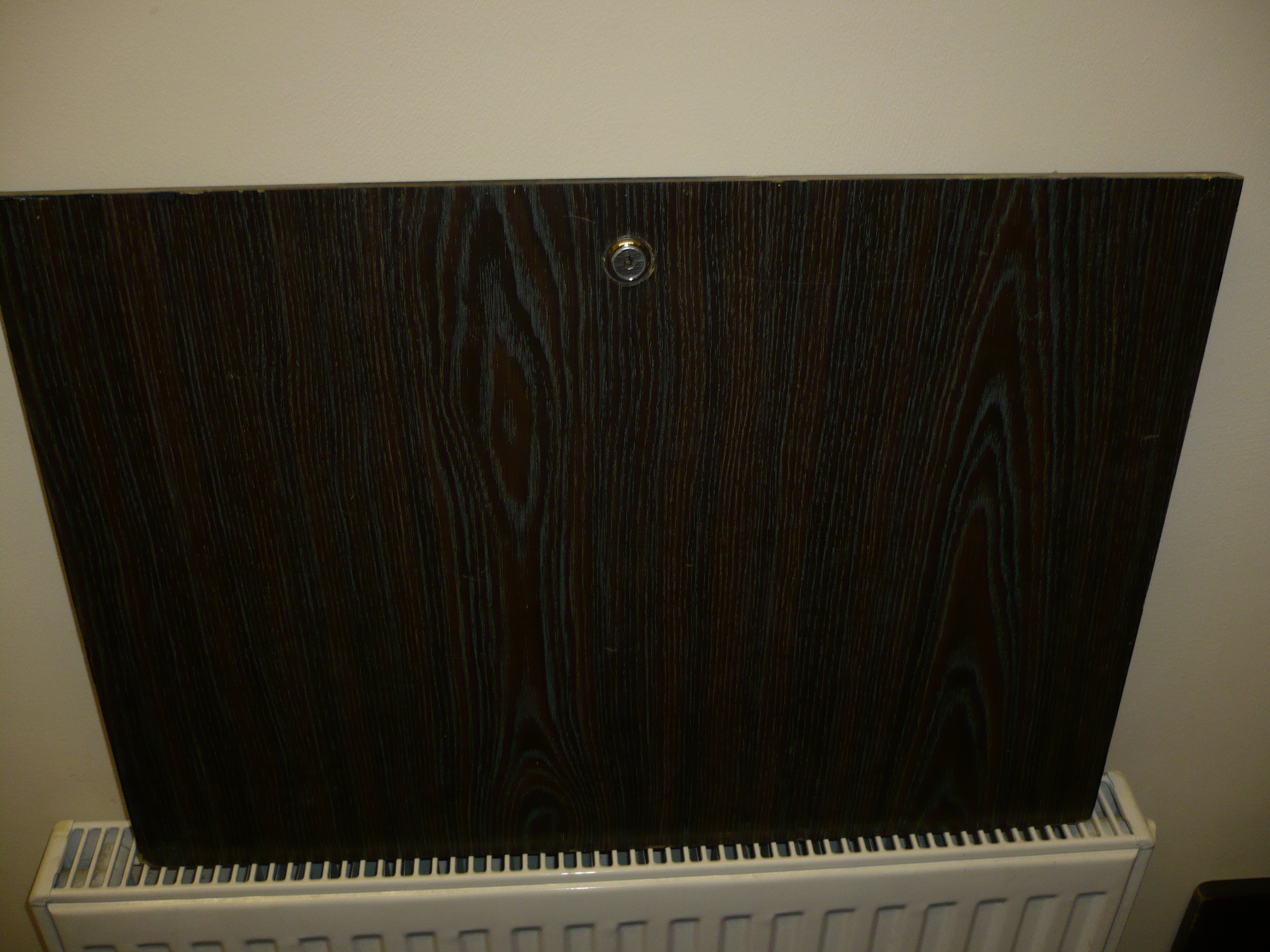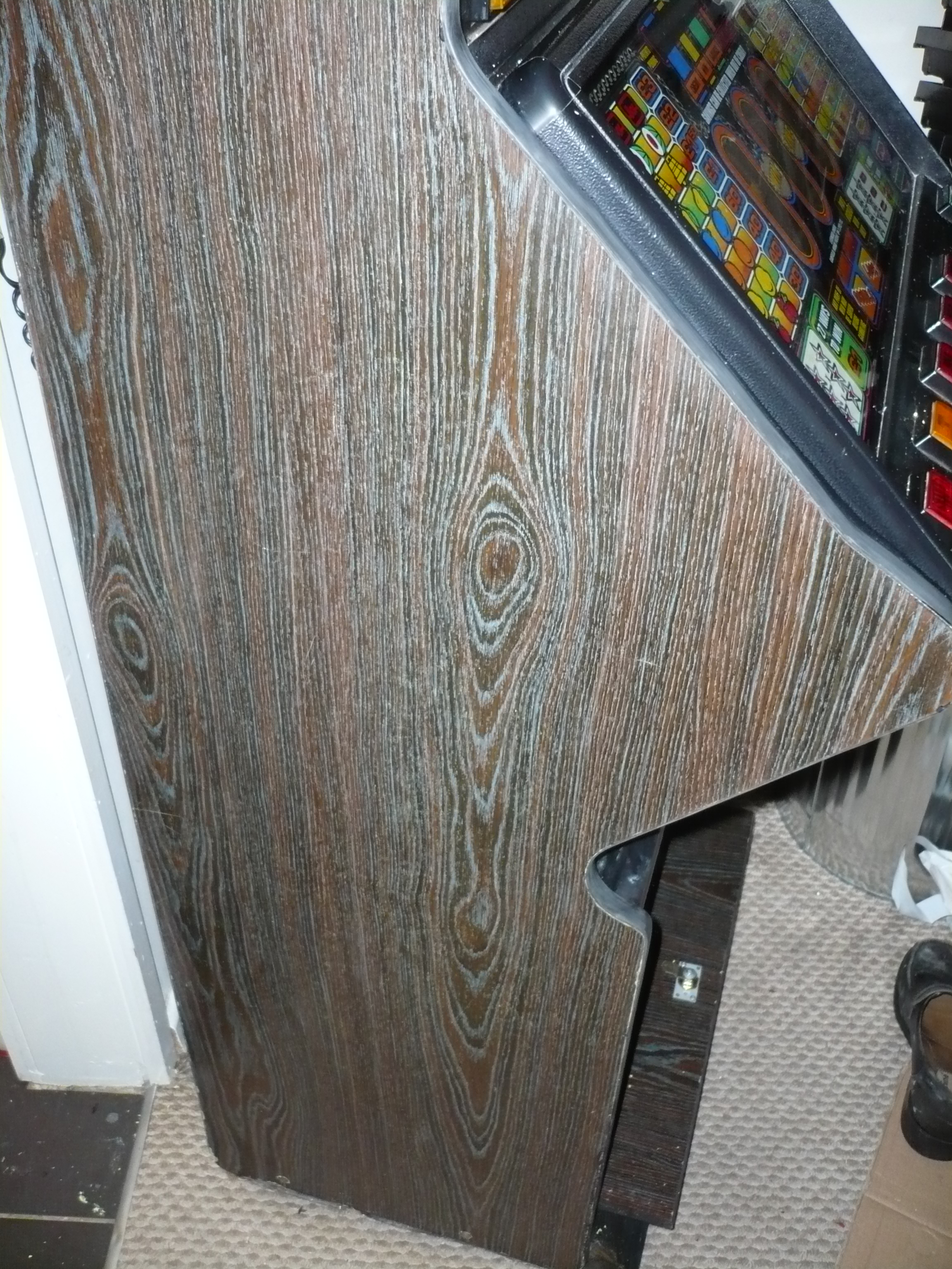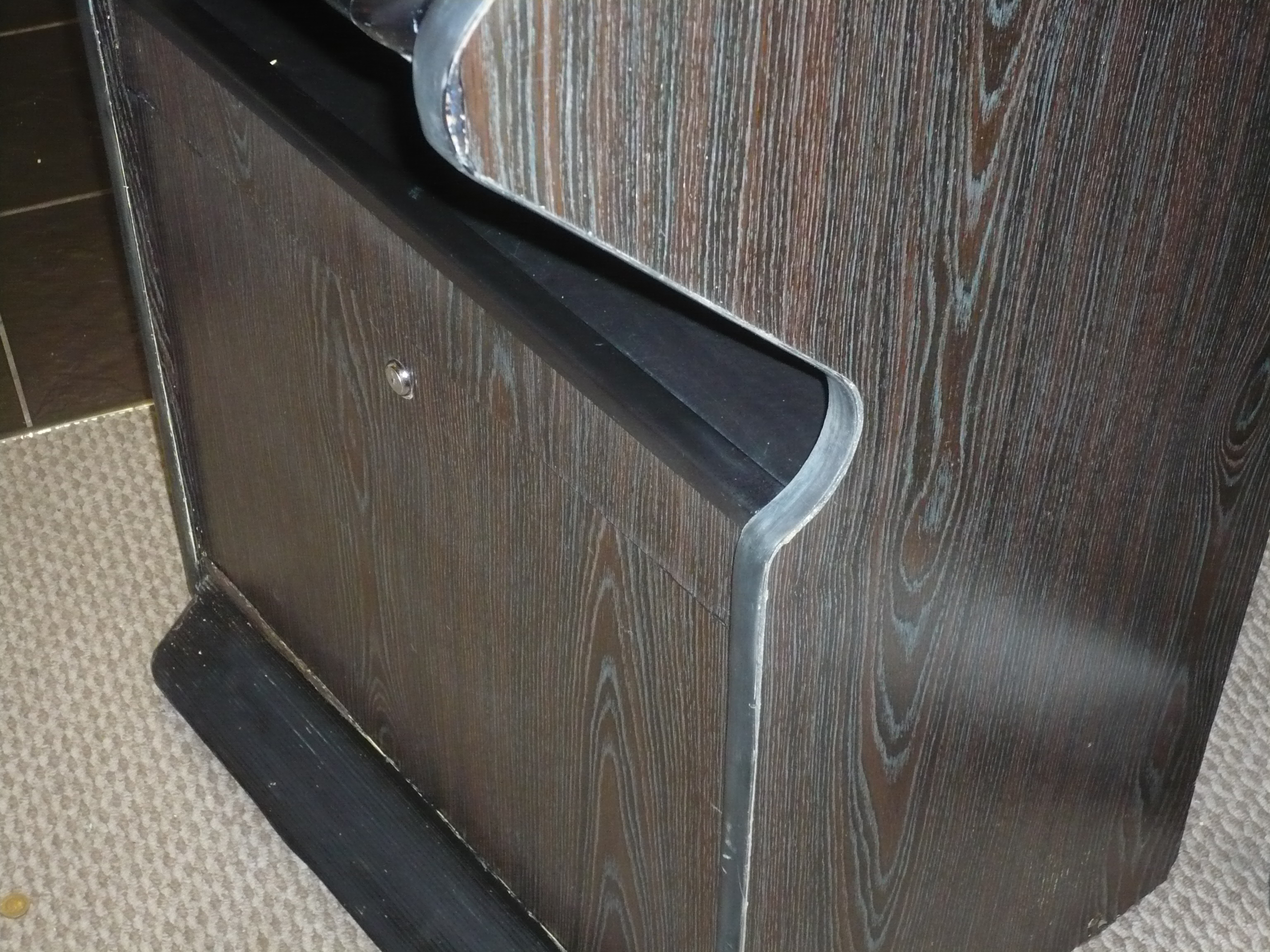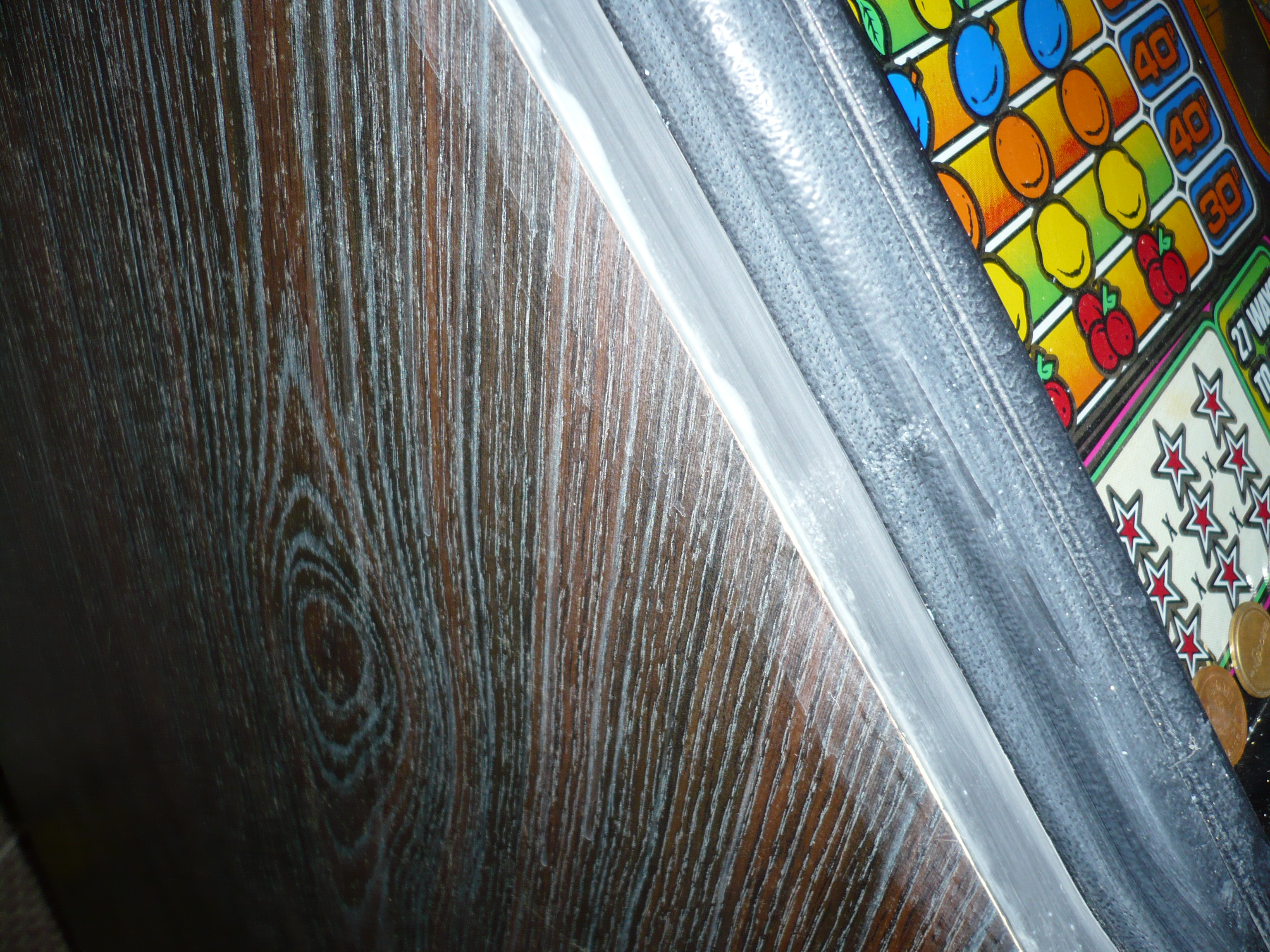 The entire Golden Award cabinet had been painted in magnolia emulsion and then purple emulsion had been sponged onto top. The T-mold had been painted purple. It took me 10 hours to strip it off using Nitromores, wire wool, lots of hot water and many scouring pads.